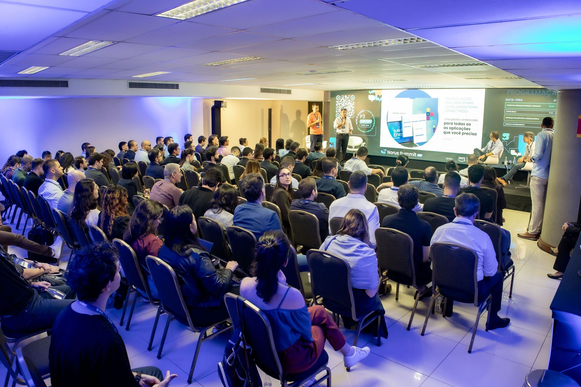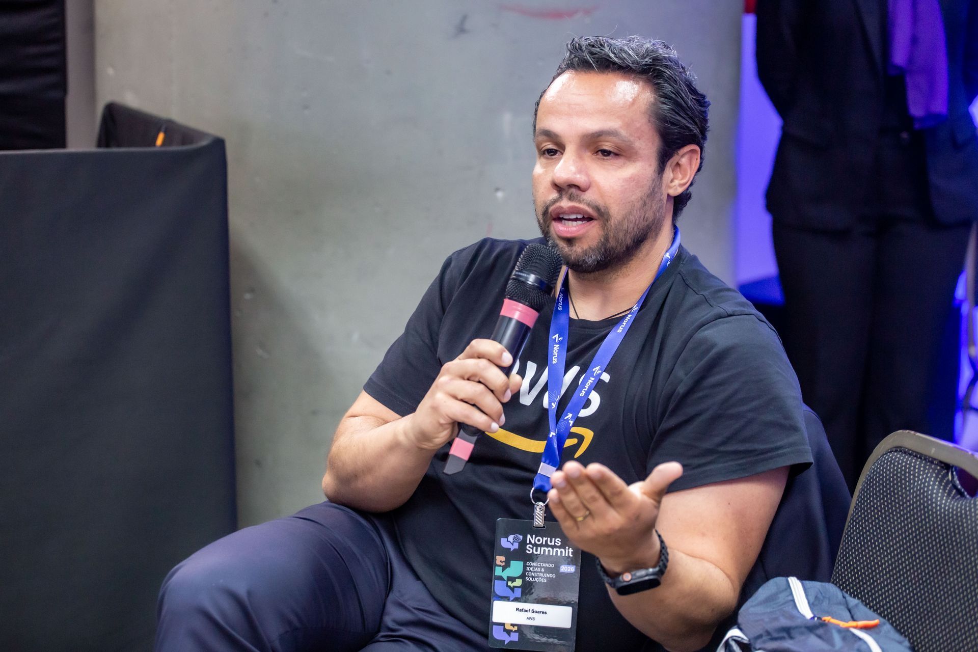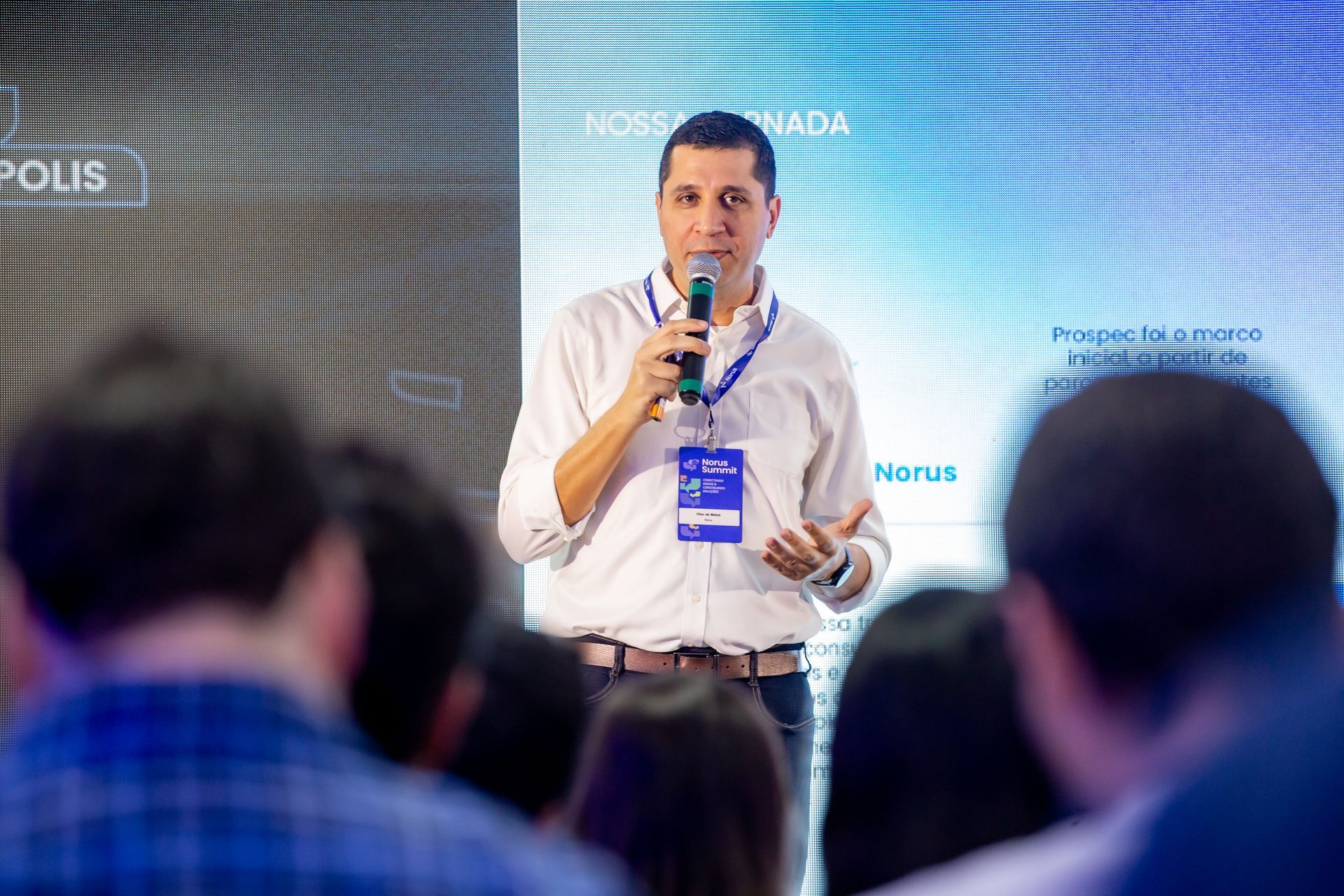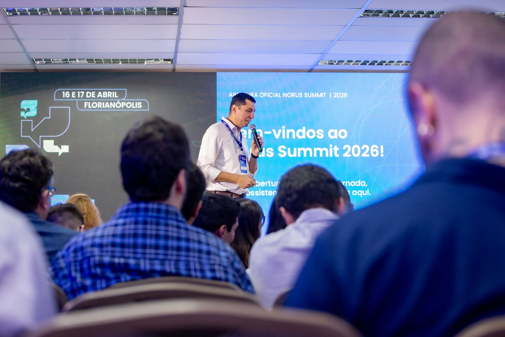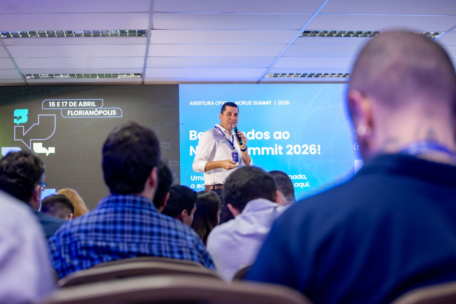 A abertura do evento foi conduzida pelo fala do CEO da Norus Vitor Luiz de Matos, com agradecimentos especiais ao parceiro AWS, que contribuiu com o Norus Summit.