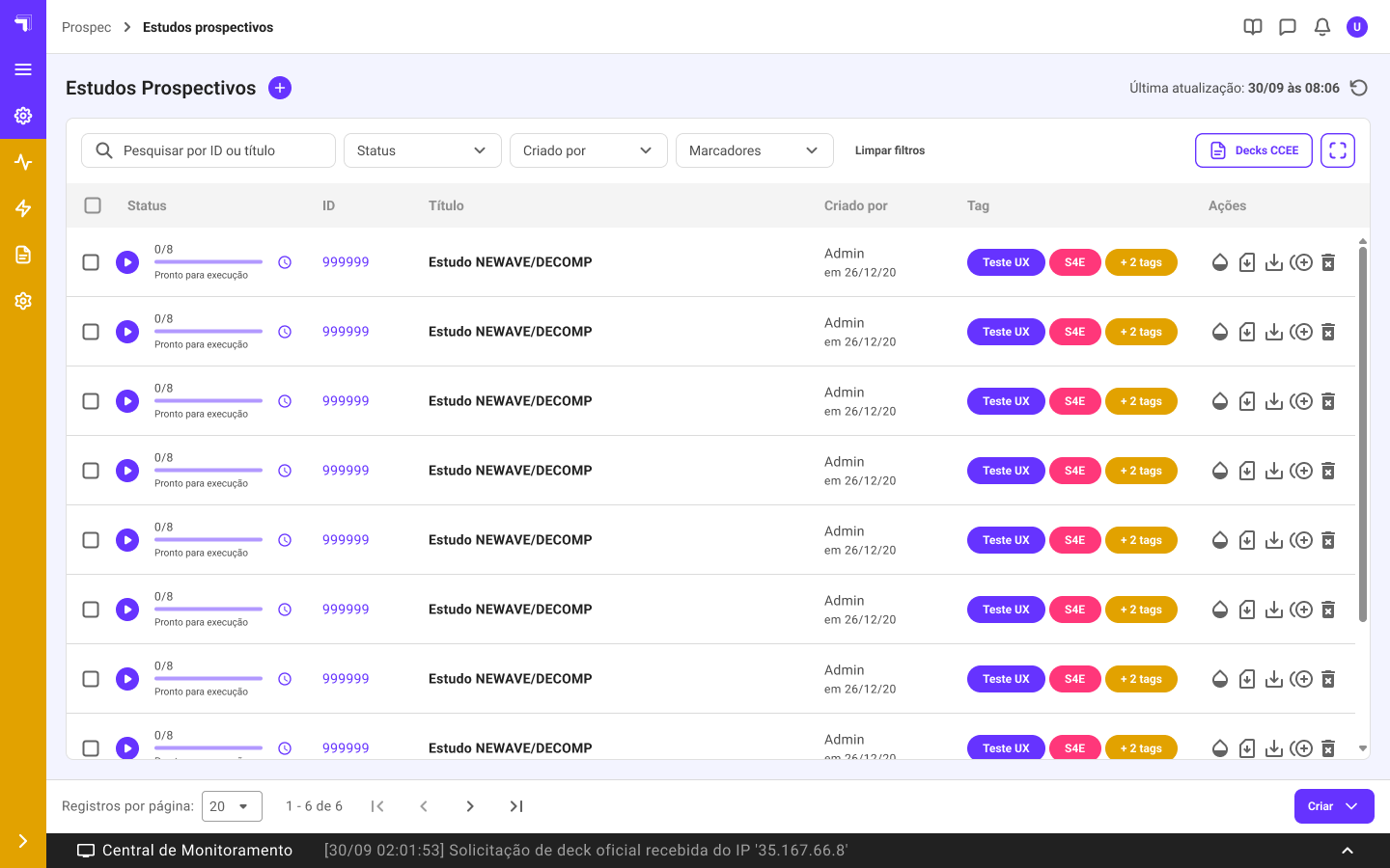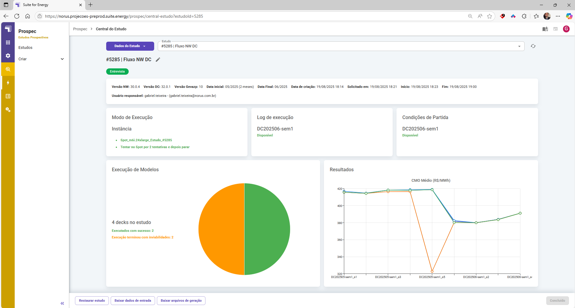 No Prospec, você pode executar estudos encadeados com NEWAVE e DECOMP, além de encadeados de DESSEM. Os arquivos são ajustados automaticamente conforme a execução acontece. Além disso, há a possibilidade de execuções de sensibilidades de vazão em decks DECOMP, basta enviar os arquivos de previsão de vazão que o Prospec faz todo o resto.